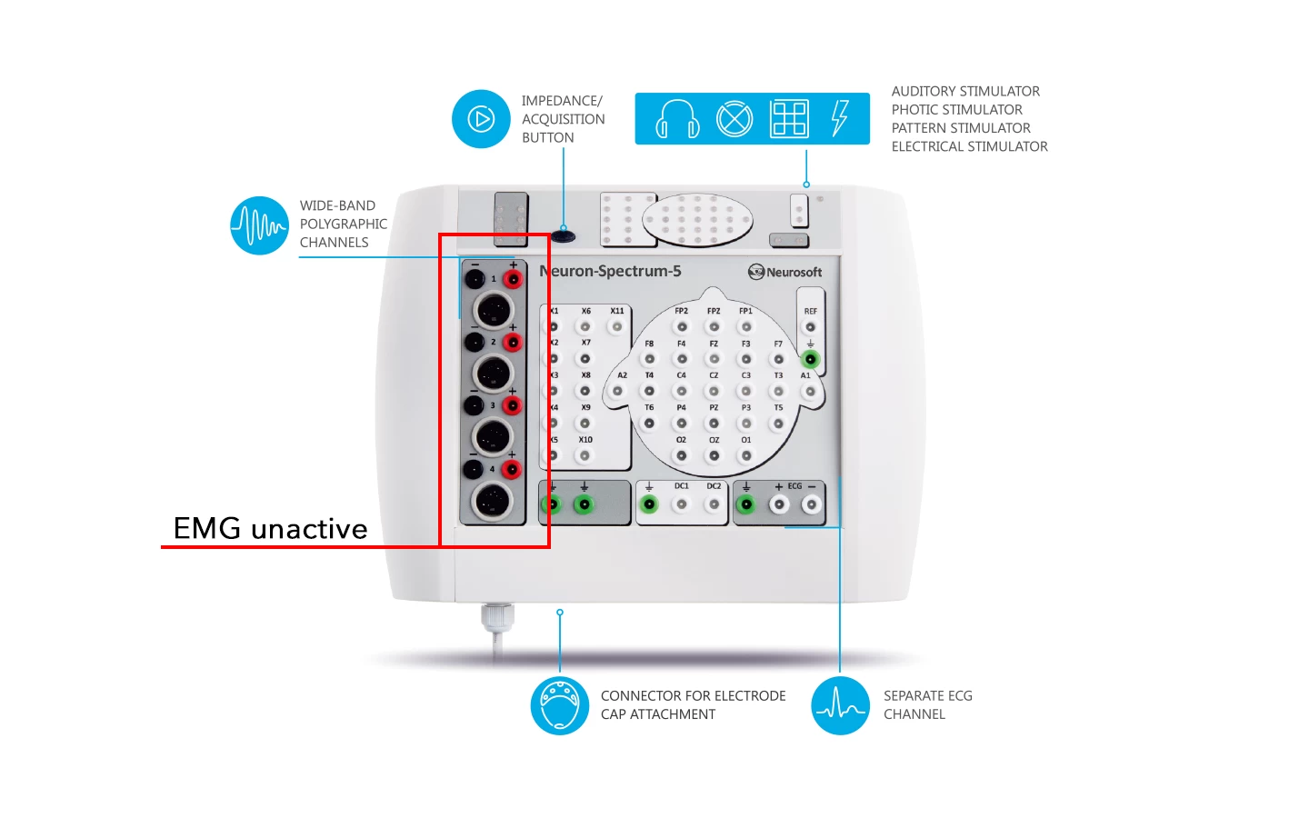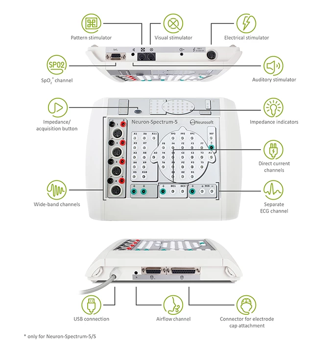 Neuron-Spectrum-5 is a versatile and expandable 32-channel digital EEG system with a large number of high-quality polygraphic channels to record any physiological signals from EOG to short-latency EP.
