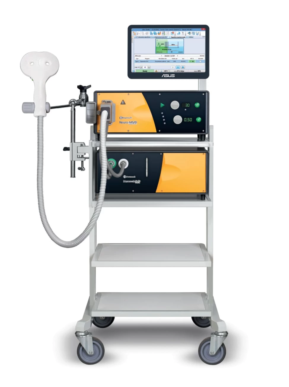It includes main unit with cooling system and cooled coil placed in a flexible arm that ensures fast and easy coil fixation in any position by rotating one screw. All that is mounted on a smooth-running trolley. The computer to control the stimulation can be also included in the delivery set. In this configuration system allows performing long-term sessions of biphasic rTMS with up to 30 Hz frequencies and up to 5 Hz maximum intensity.